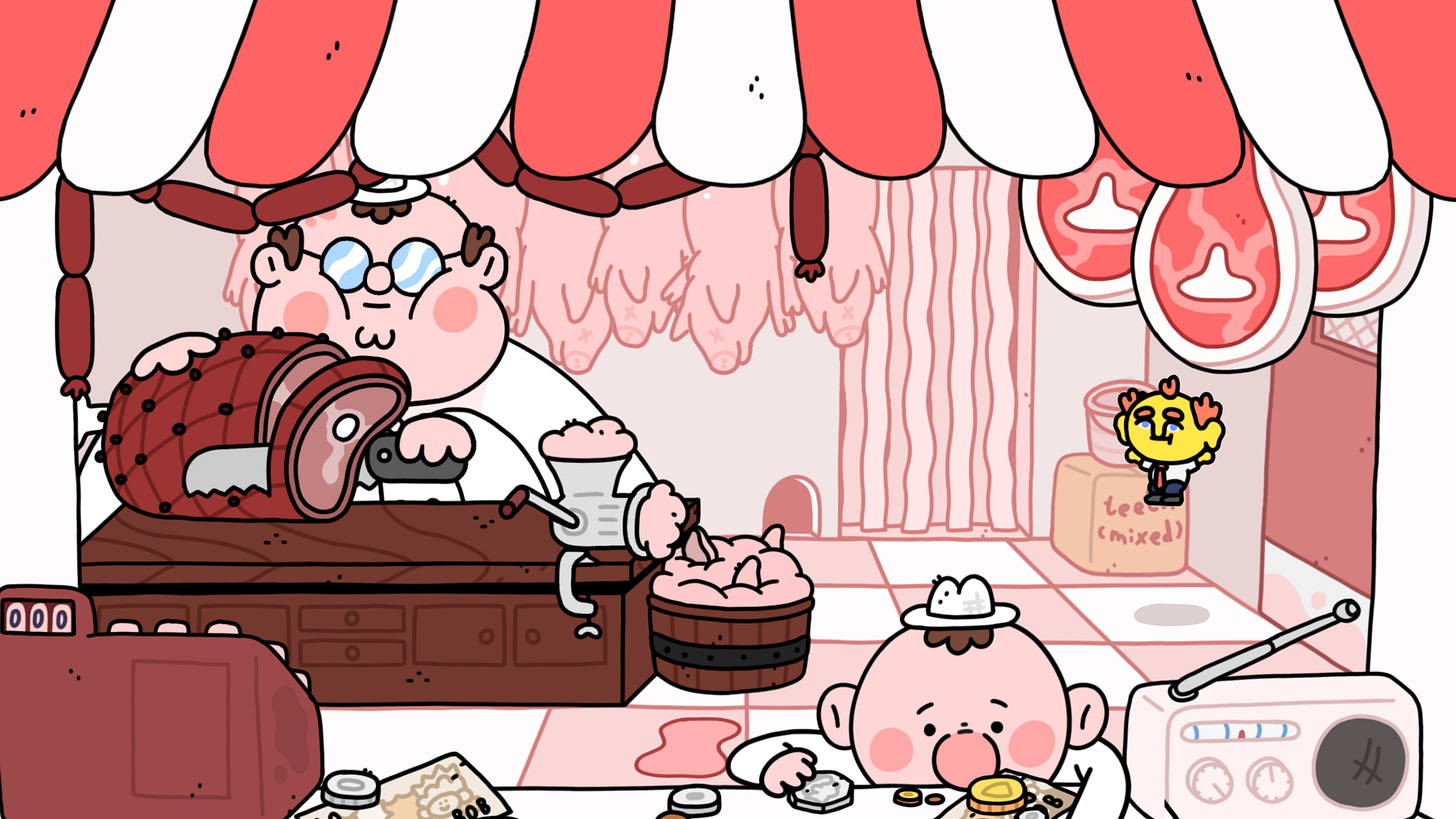 As you head down to the town centre, you pass by Sam’s Hams - pop in for a delightfully fleshy experience as you try and find the meat to make Big Ron’s Big Pies. Make sure you collect all the steaks and slap all the flesh-trees, so Sam can reach his final meaty form!